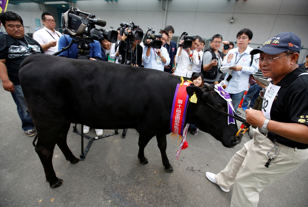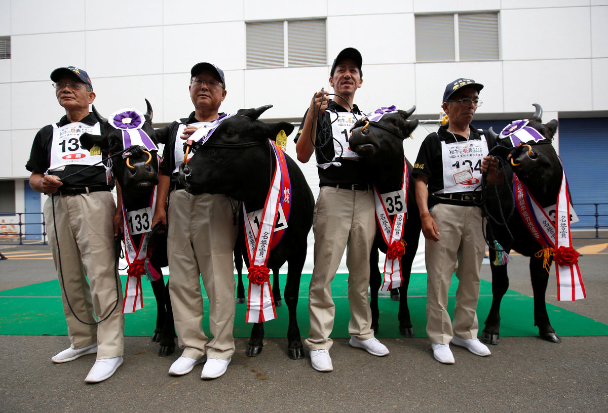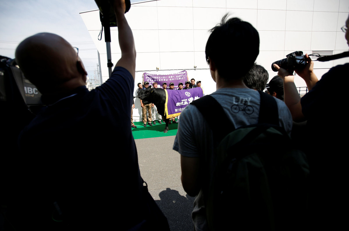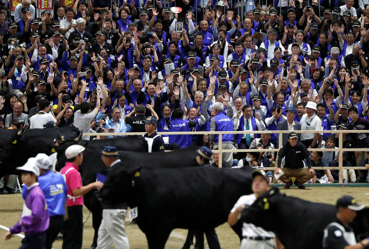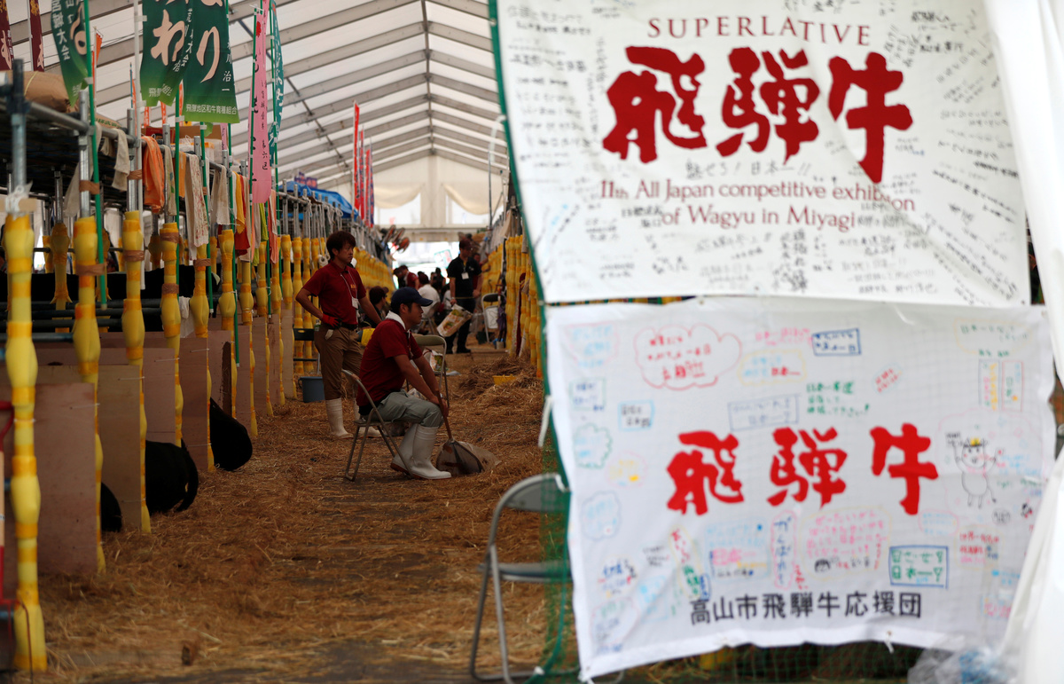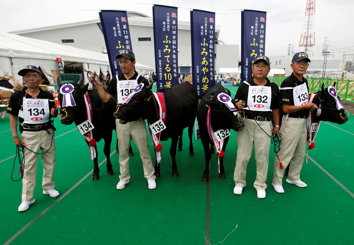 Visitors show off a banner cheering Kobe Beef during a division of breeding cattle category competition at 11th National Japanese Beef Ability Expo, commonly known as Wagyu Olympics, in Sendai, northern Japan September 10, 2017. Picture taken September 10, 2017. REUTERS/Issei KatoA man checks the pictures of award-winning carcass of beef cattle competitions at 11th National Japanese Beef Ability Expo, commonly known as Wagyu Olympics, in Sendai, northern Japan September 10, 2017. Picture taken September 10, 2017. REUTERS/Issei KatoCattle and breeders take part in a competition at breeding cattle category - young bull division competition at 11th National Japanese Beef Ability Expo, commonly known as Wagyu Olympics, in Sendai, northern Japan September 10, 2017. Picture taken September 10, 2017. REUTERS/Issei KatoVisitors are seen at the main entrance of the 11th National Japanese Beef Ability Expo, commonly known as Wagyu Olympics, in Sendai, northern Japan September 10, 2017. Picture taken September 10, 2017. REUTERS/Issei KatoBreeding cattle take part in a competition at 11th National Japanese Beef Ability Expo, commonly known as Wagyu Olympics, in Sendai, northern Japan September 10, 2017. Picture taken September 10, 2017. REUTERS/Issei KatoA visitor poses for a photographer with official cattle mascot Ushi-Masamune at 11th National Japanese Beef Ability Expo, commonly known as Wagyu Olympics, in Sendai, northern Japan September 11, 2017. REUTERS/Issei KatoVisitors are seen at the main entrance of the 11th National Japanese Beef Ability Expo, commonly known as Wagyu Olympics, in Sendai, northern Japan September 10, 2017. Picture taken September 10, 2017. REUTERS/Issei KatoA cattle, breeders and officials pose for a photograph during a photo session after winning a breeding cattle category competition at 11th National Japanese Beef Ability Expo, commonly known as Wagyu Olympics, in Sendai, northern Japan September 10, 2017. Picture taken September 10, 2017. REUTERS/Issei KatoBreeding cattle take part in a competition at 11th National Japanese Beef Ability Expo, commonly known as Wagyu Olympics, in Sendai, northern Japan September 10, 2017. Picture taken September 10, 2017. REUTERS/Issei KatoA group of female Bungo cattle from Oita prefecture, Fumigiku, Fumiayame, Fumiteru 10 and Fumiroman, are posed for a photograph with their owners including Tadanao Sato during a photo session after captured grand prize of the breeding cattle category at 11th National Japanese Beef Ability Expo, commonly known as Wagyu Olympics, in Sendai, northern Japan September 11, 2017. REUTERS/Issei KatoCattle and breeders from Iwate prefecture pose for a photograph at 11th National Japanese Beef Ability Expo, commonly known as Wagyu Olympics, in Sendai, northern Japan September 10, 2017. Picture taken September 10, 2017. REUTERS/Issei KatoAward-winning cattle parade at 11th National Japanese Beef Ability Expo, commonly known as Wagyu Olympics, in Sendai, northern Japan September 11, 2017. REUTERS/Issei KatoA female Bungo cattle Fumiayame from Oita prefecture and her owner Tadanao Sato are surrounded by media after captured grand prize of the breeding cattle category at 11th National Japanese Beef Ability Expo, commonly known as Wagyu Olympics, in Sendai, northern Japan September 11, 2017. REUTERS/Issei Kato