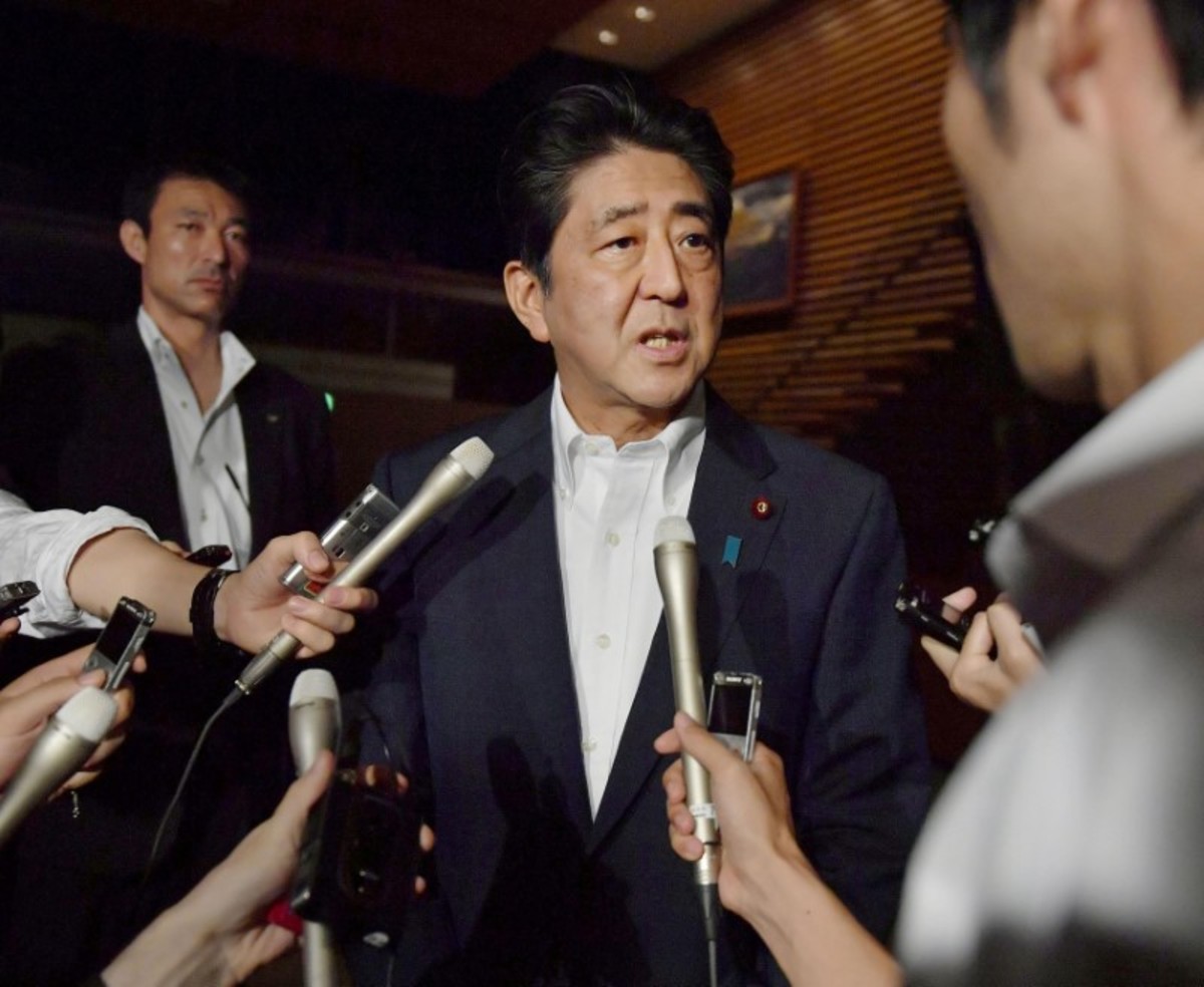 Japanese Prime Minister Shinzo Abe speaks to reporters about North Korea's missile launch in Tokyo, Japan in this photo taken by Kyodo on July 29, 2017. Mandatory credit Kyodo/via REUTERS