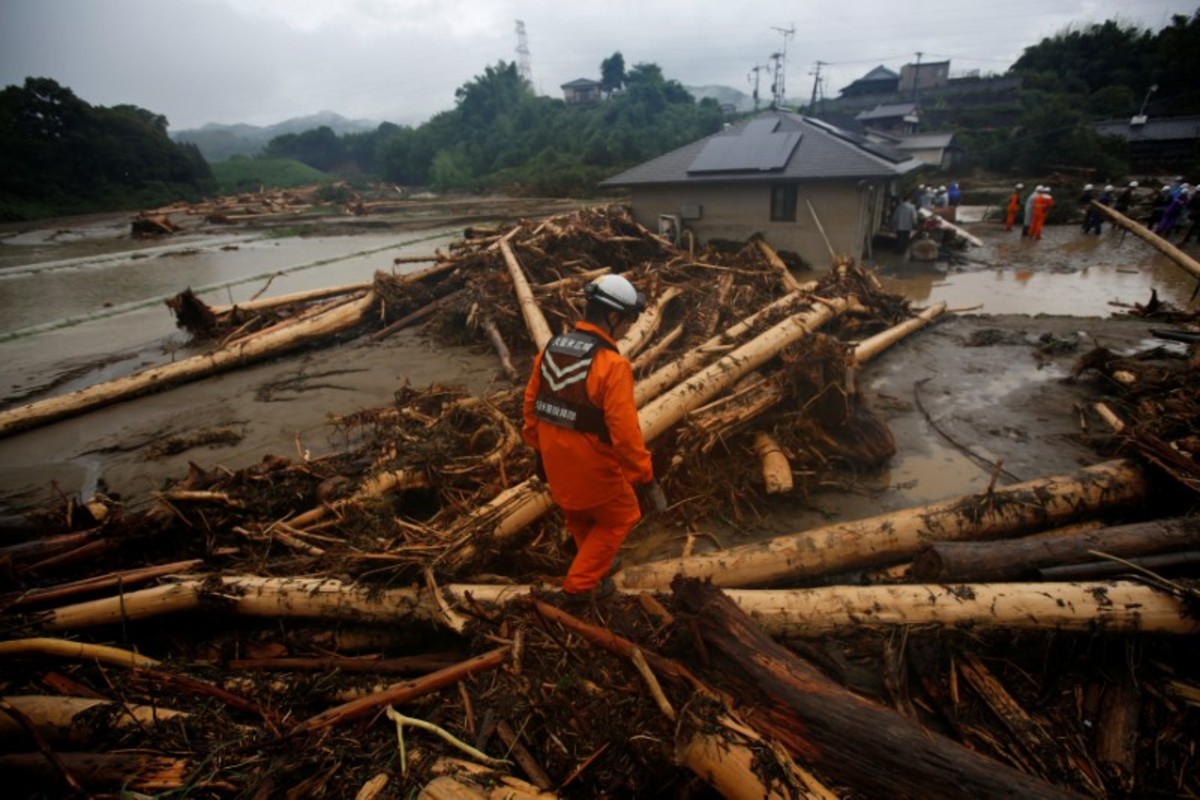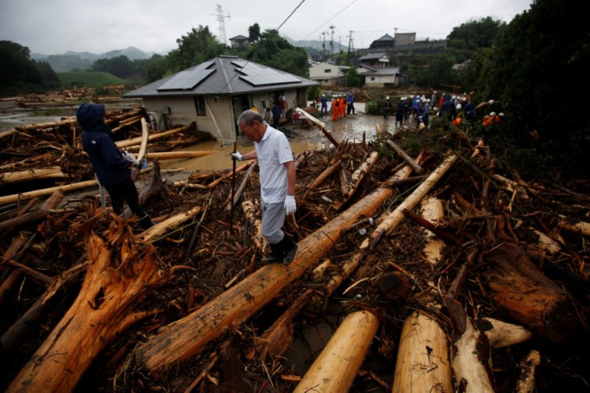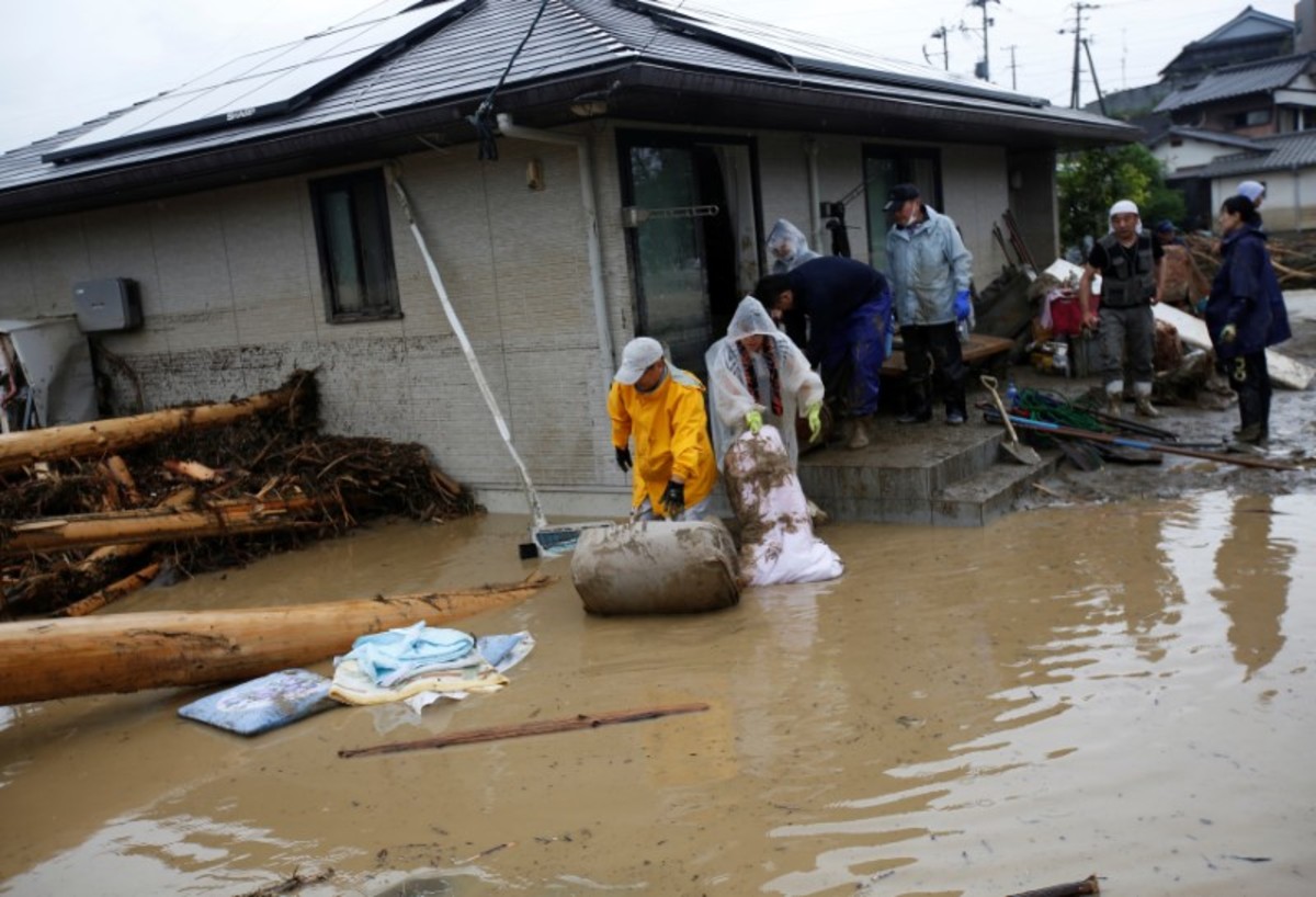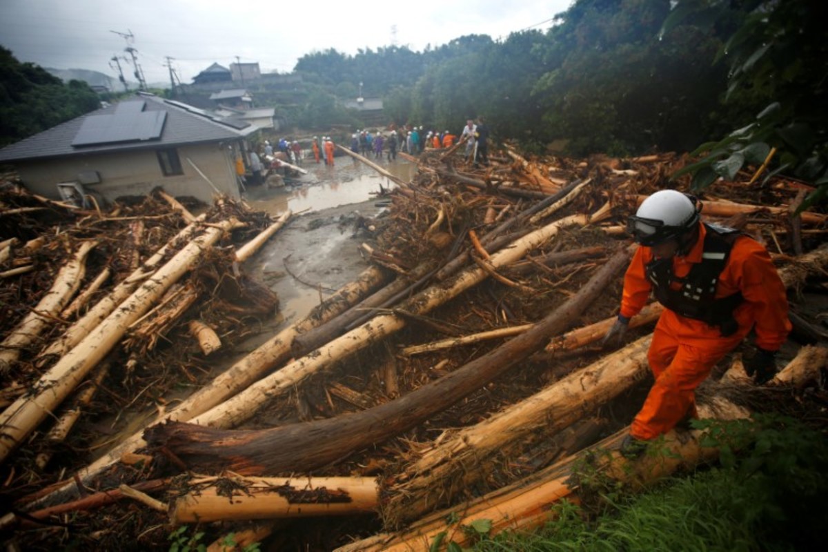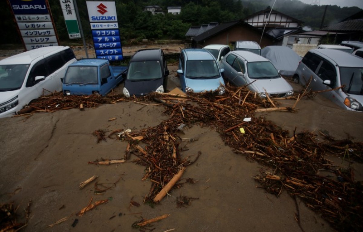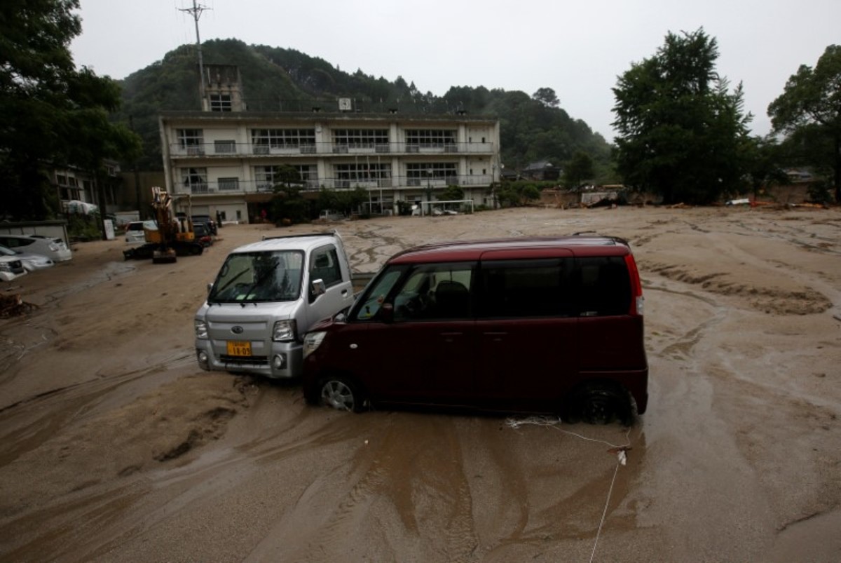 Damage vehicles are seen at an area hit by heavy rain at Haki district in Asakura, Fukuoka Prefecture, Japan July 7, 2017. REUTERS/Issei KatoLocal residents walk past a soccer goalpost surrounded by debris and mud which were swept by heavy rain at the playground of Masue elementary school, where local residents were temporary evacuated to, at Haki district in Asakura, Fukuoka Prefecture, Japan July 7, 2017. REUTERS/Issei KatoFamily portraits are displayed inside destroyed houses at an area hit by heavy rain at Haki district in Asakura, Fukuoka Prefecture, Japan July 7, 2017. REUTERS/Issei KatoDebris which were swept by heavy rain are seen inside a gymnasium at Masue elementary school, where local residents were temporary evacuated to, at Haki district in Asakura, Fukuoka Prefecture, Japan July 7, 2017. REUTERS/Issei KatoDamaged cars are seen at Masue elementary school, where local residents were temporary evacuated to, at an area hit by heavy rain at Haki district in Asakura, Fukuoka Prefecture, Japan July 7, 2017. REUTERS/Issei KatoA page from a student yearbook, which is stained with mud, is seen at an area hit by heavy rain at Haki district in Asakura, Fukuoka Prefecture, Japan July 7, 2017. REUTERS/Issei KatoA rescue worker walks on wooden debris which were swept away caused by heavy rain as rescue workers search missing people near a damages house at Yamada district in Asakura, Fukuoka Prefecture, Japan July 7, 2017. REUTERS/Issei KatoA local resident walks in an area damaged by swollen river after heavy rain in Asakura, Fukuoka Prefecture, Japan. REUTERS/Issei KatoLocal residents react as they watch search and rescue operation by rescue workers in front of their damaged house at Yamada district in Asakura, Fukuoka Prefecture, Japan July 7, 2017. REUTERS/Issei KatoA police officer conducts search and rescue operation in the rain at an area hit by heavy rain at Yamada district in Asakura, Fukuoka Prefecture, Japan July 7, 2017. REUTERS/Issei KatoLocal residents try to remove their belongings from their damaged house at an area hit by heavy rain at Yamada district in Asakura, Fukuoka Prefecture, Japan July 7, 2017. REUTERS/Issei KatoRescue workers conduct search and rescue operation in the heavy rain near a damaged house at an area hit by heavy rain at Yamada district in Asakura, Fukuoka Prefecture, Japan July 7, 2017. REUTERS/Issei KatoA rescue worker walks on wooden debris which were swept away by heavy rain as rescue workers search for missing people near a damaged house at Yamada district in Asakura, Fukuoka Prefecture, Japan July 7, 2017. REUTERS/Issei KatoA local resident walks on wooden debris which were swept away by heavy rain as rescue workers search for missing people near a damaged house at Yamada district in Asakura, Fukuoka Prefecture, Japan July 7, 2017. REUTERS/Issei Kato