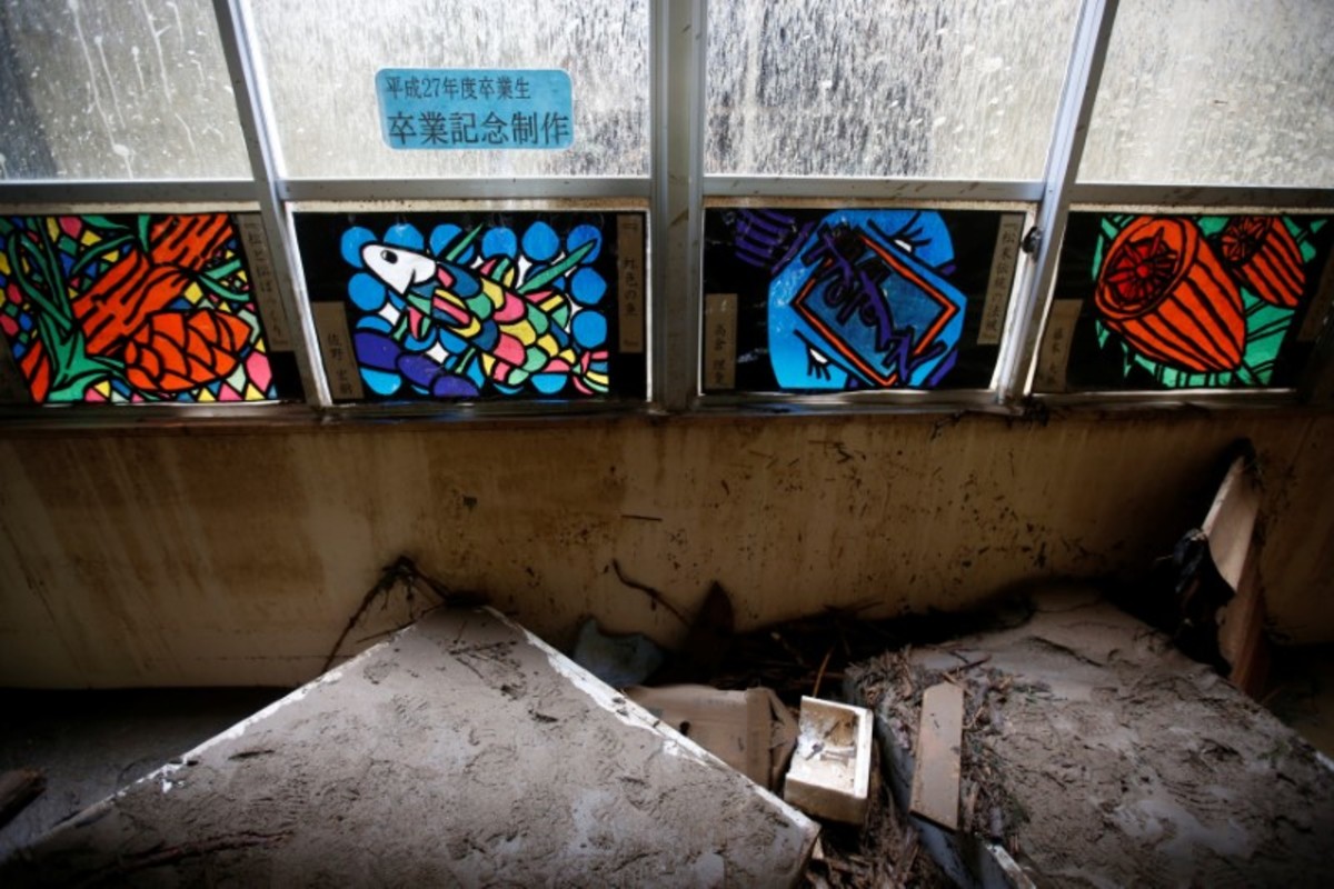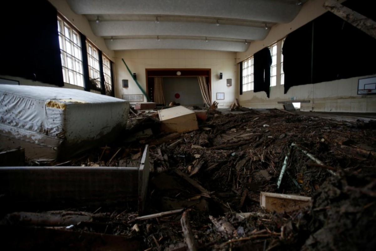 Debris that were swept by heavy rain are seen inside Masue elementary school, where local residents were temporary evacuated to, at Haki district in Asakura, Fukuoka Prefecture, Japan July 7, 2017. REUTERS/Issei Kato