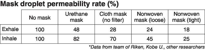 A research team from Riken, Kobe University and other institutes found that the droplet permeability rate is higher with urethane masks than with nonwoven products when both inhaling and exhaling.