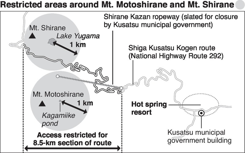 Although volcanic activity has eased in the vicinity, known as the Mt. Kusatsushirane area, locations around the crater remain off-limits, while National Highway Route 292 -- also known as the Shiga Kusatsu Kogen route -- which connects the popular hot spring resort town of Kusatsu and Nagano Prefecture, remains closed.