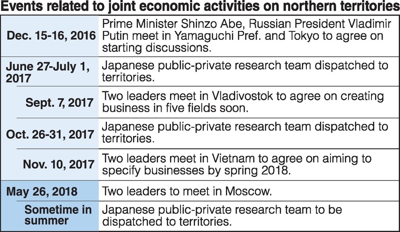 The Japanese government will dispatch a public-private research team to the northern territories as early as this summer to draw up business plans. The governments are making arrangements toward an agreement during a summit meeting between Prime Minister Shinzo Abe and Russian President Vladimir Putin scheduled for Saturday in Moscow.