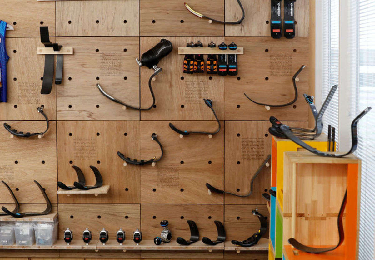 Prosthetic "blades" are displayed at a special "library" that lets people borrow and try out prosthetic "blades" for runners, in Tokyo, Japan, October 15, 2017. Picture taken October 15, 2017. REUTERS/Kim Kyung-Hoon
