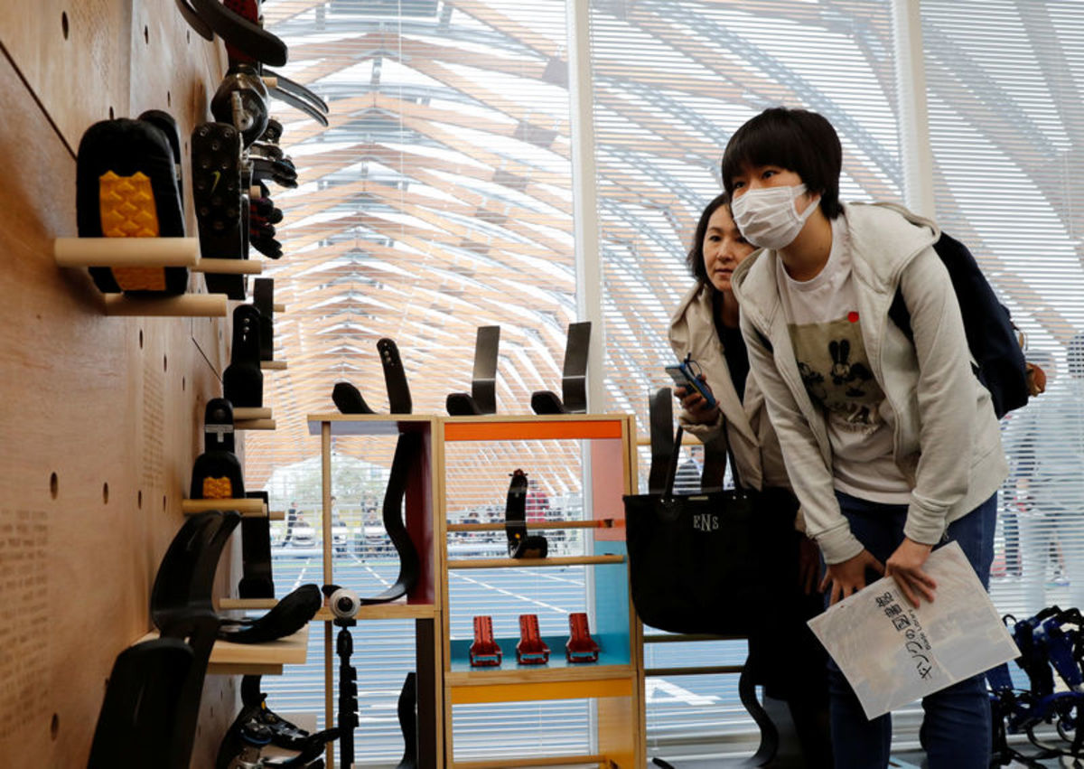Visitors look around prosthetic "blades" during an opening ceremony of a special "library" that lets people borrow and try out prosthetic "blades" for runners, in Tokyo, Japan, October 15, 2017. Picture taken October 15, 2017. REUTERS/Kim Kyung-Hoon