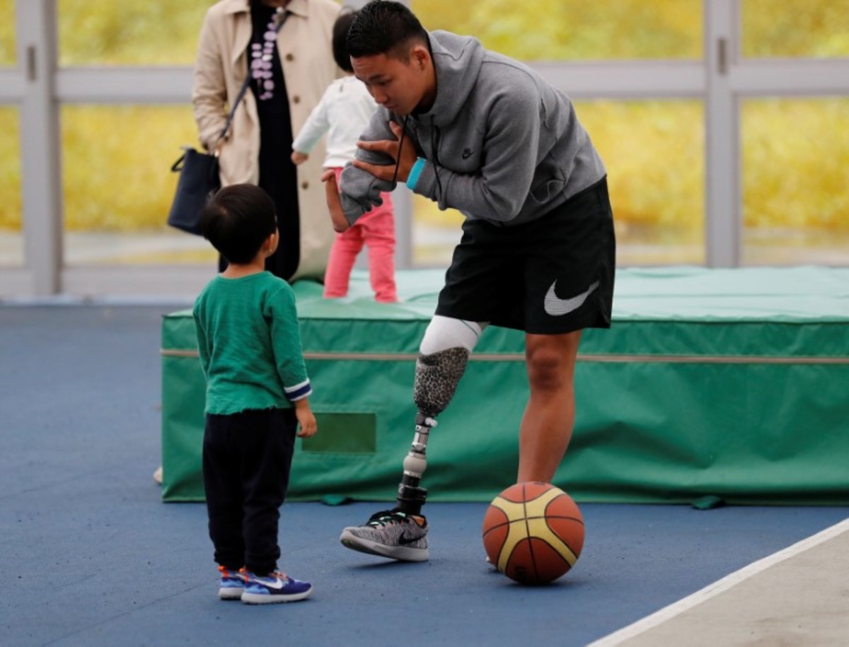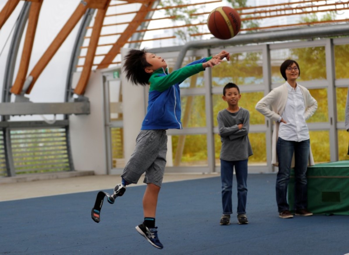 Chie Yamashita demonstrates a prosthetic "blade" during an opening ceremony of a special "library" that lets people borrow and try out prosthetic "blades" for runners, in Tokyo, Japan, October 15, 2017. Picture taken October 15, 2017. REUTERS/Kim Kyung-HoonHaruta Saito wearing a prosthetic "blade" looks at other children during an opening ceremony of a special "library" that lets people borrow and try out prosthetic "blades" for runners, in Tokyo, Japan, October 15, 2017. Picture taken October 15, 2017. REUTERS/Kim Kyung-HoonHaruta Saito wearing a prosthetic "blade" plays basketball during an opening ceremony of a special "library" that lets people borrow and try out prosthetic "blades" for runners, in Tokyo, Japan, October 15, 2017. Picture taken October 15, 2017. REUTERS/Kim Kyung-HoonA participant wearing a prosthetic leg talks with a boy during an opening ceremony of a special "library" that lets people borrow and try out prosthetic "blades" for runners, in Tokyo, Japan, October 15, 2017. Picture taken October 15, 2017. REUTERS/Kim Kyung-Hoon