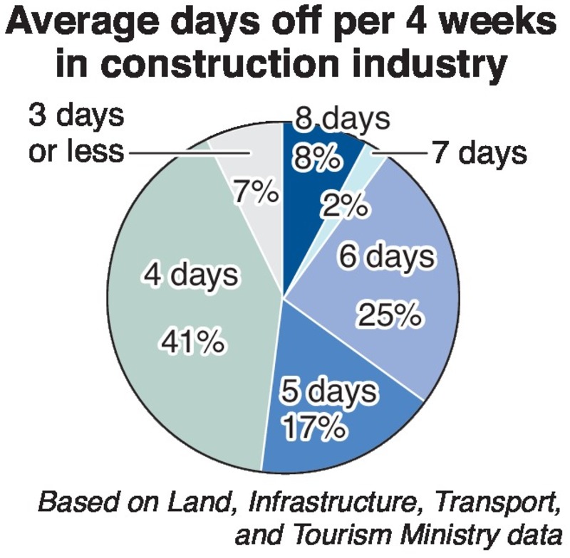 The Land, Infrastructure, Transport and Tourism Ministry drew up guidelines for the reform, promoting the effort for two days off per week in collaboration with the private sector. However, the key to the reform is raising awareness among entities that set construction schedules, including local governments and private firms.