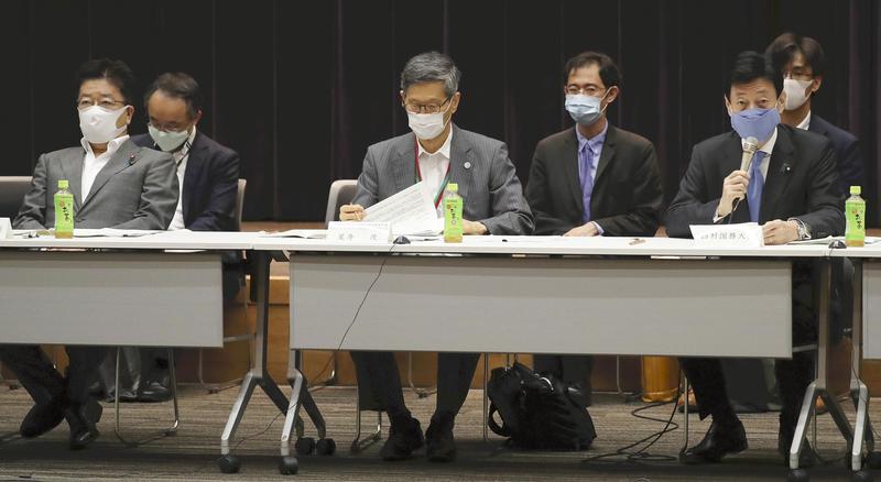 Yasutoshi Nishimura, right, the economic revitalization minister who is in charge of coronavirus measures, speaks at a meeting of the government's task force on the novel coronavirus in Tokyo on Friday.