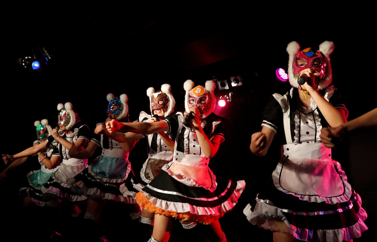 Dressed in maid costumes and wearing wrestling masks adorned with fuzzy pom-pom ears and cryptocurrency symbols the eight Virtual Currency Girls are a pop music manifestation of the digital currency frenzy that has swept Japan and other parts of the world.