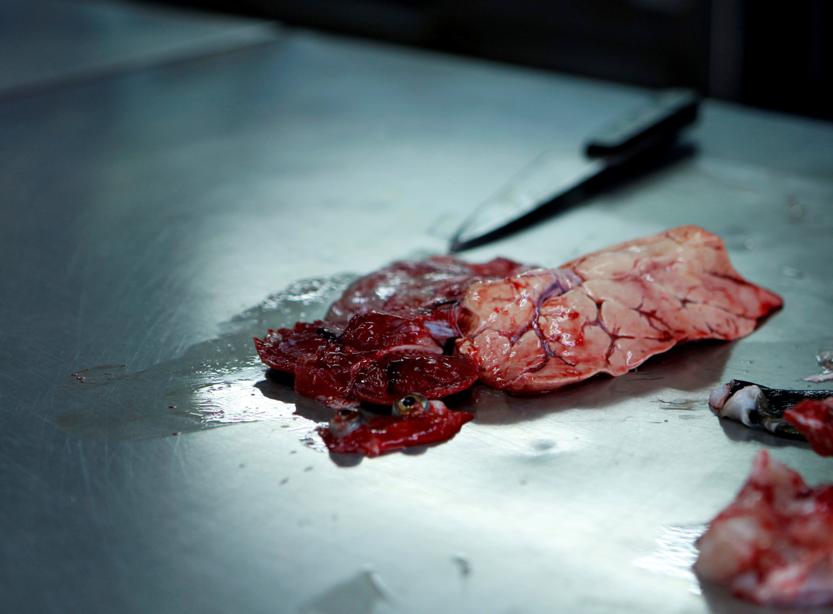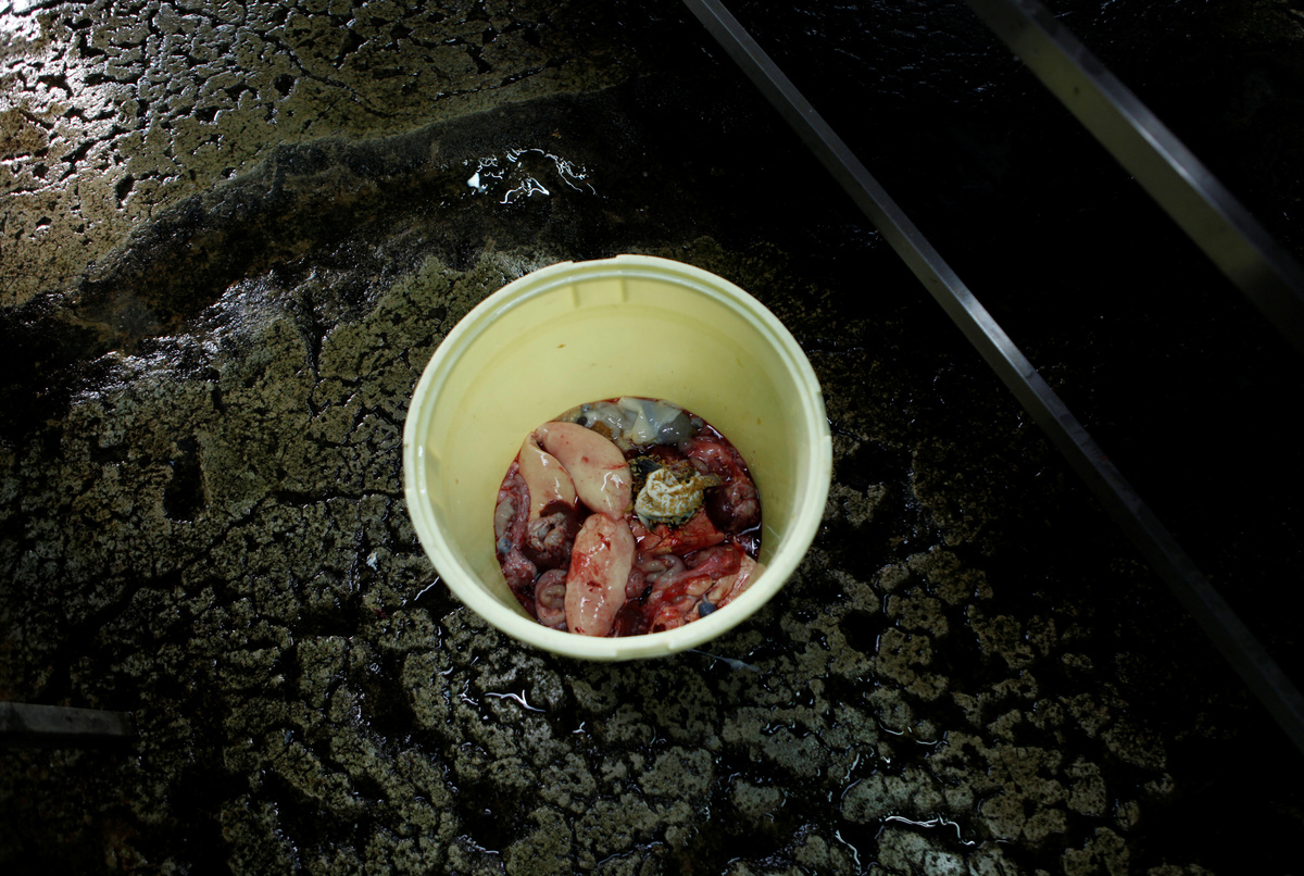 He skins and guts it while its heart still beats, deftly removing the poisonous parts and tossing them into a bucket on the floor for disposal.