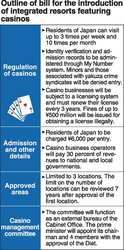 The bill, which was approved at a plenary session of the upper house by a majority vote with support mainly from the ruling coalition of the Liberal Democratic Party and Komeito, along with Nippon Ishin no Kai, allows for the introduction of up to three integrated resorts with casinos across the nation. Casino operators will be required to acquire a certificate that is effective for three years and renewable.
