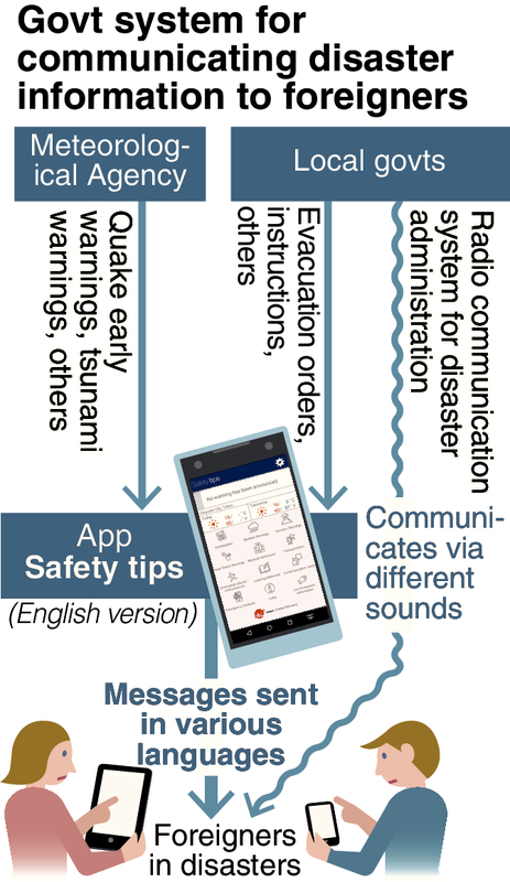 The agency is encouraging foreign visitors to download Safety tips. In reality, however, foreigners who visit Japan when there are no disasters are not using the app, according to a senior official at the agency. The agency is distributing flyers at airports and tourism information centers, urging foreigners to be ready.