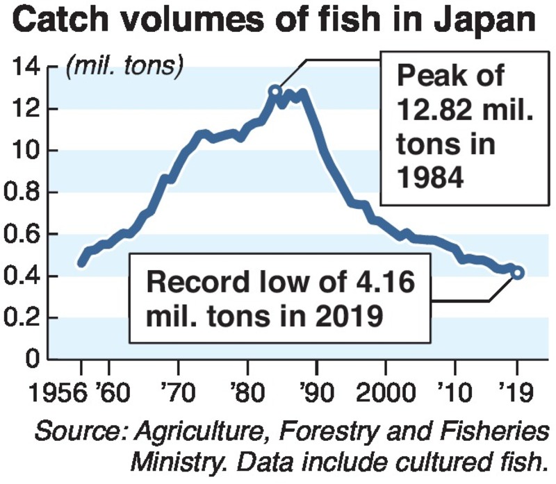 Catch volumes in Japan (including cultured fish), which peaked in 1984 at 12.82 million tons, sunk to a record low of 4.16 million tons in 2019. In recent years, catches of Pacific saury and Japanese flying squid, among others, have hit record lows across the board.