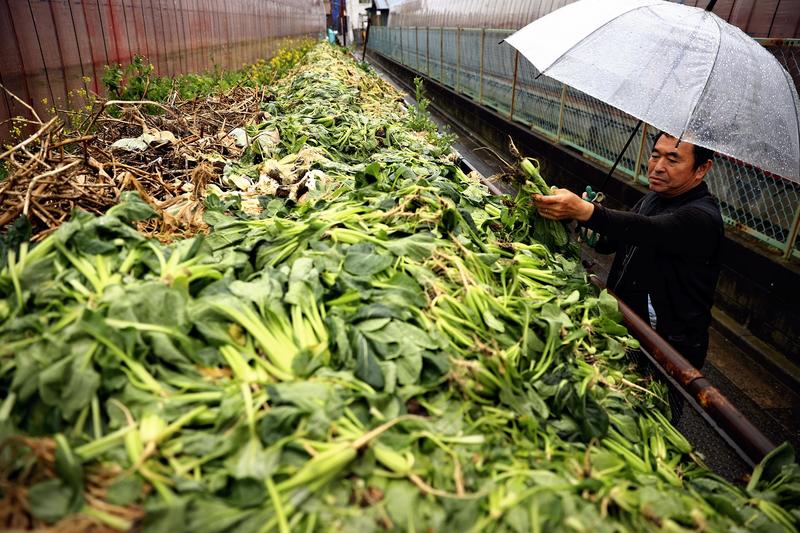Vegetables piling up beside a greenhouse during harvest were not bound for anyone's table. Just two months after planting the seeds, a farmer in Adachi Ward, Tokyo, was discarding komatsuna Japanese mustard spinach.