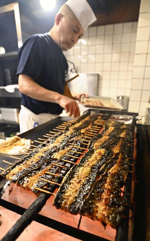 A cook at the kabayaki-style unagi restaurant Shibuya Matsukawa in Shibuya Ward started grilling the freshwater eels from the morning. The restaurant prepared about 500 servings, four times more than usual.