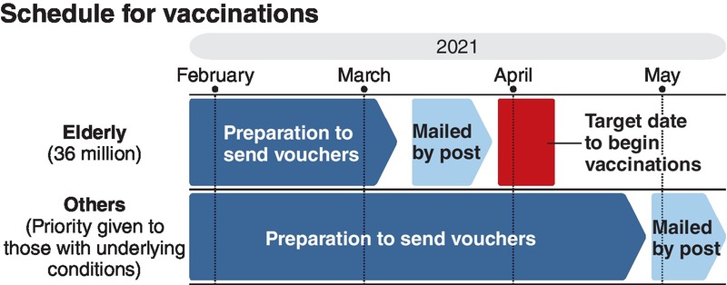People aged 65 and older will be given priority for inoculation against the novel coronavirus, and vouchers for vaccinations are scheduled to be sent out from mid-March. The Health, Labor and Welfare Ministry announced Monday at a briefing session for local governments that it expected to administer the required two doses of vaccine over a period of about three months.