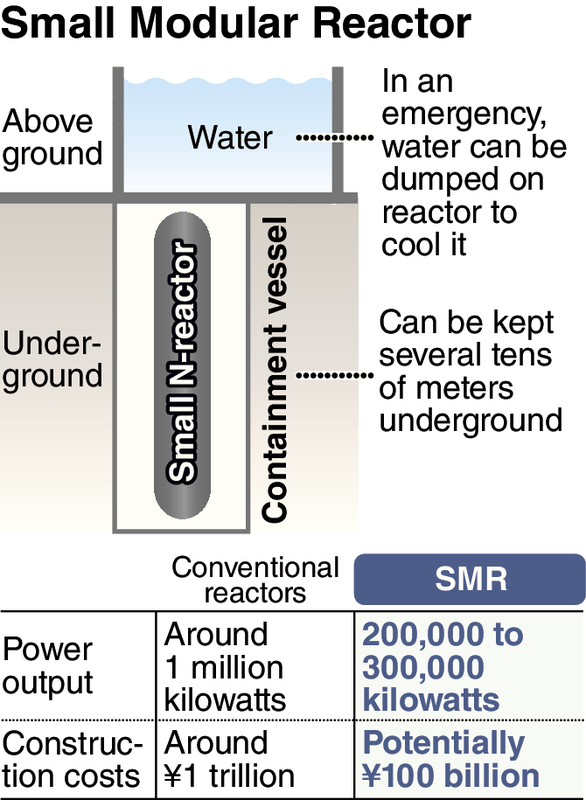 Though SMRs have yet to enter commercial use in any country, it is estimated that construction costs can be kept at about 10 percent of the about 1 trillion yen needed to build a conventional reactor.