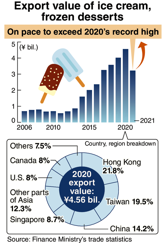 Through the first six months of this year, the total export value of ice cream and other frozen desserts reached 3.21 billion yen, more than 40% higher than the same period last year.