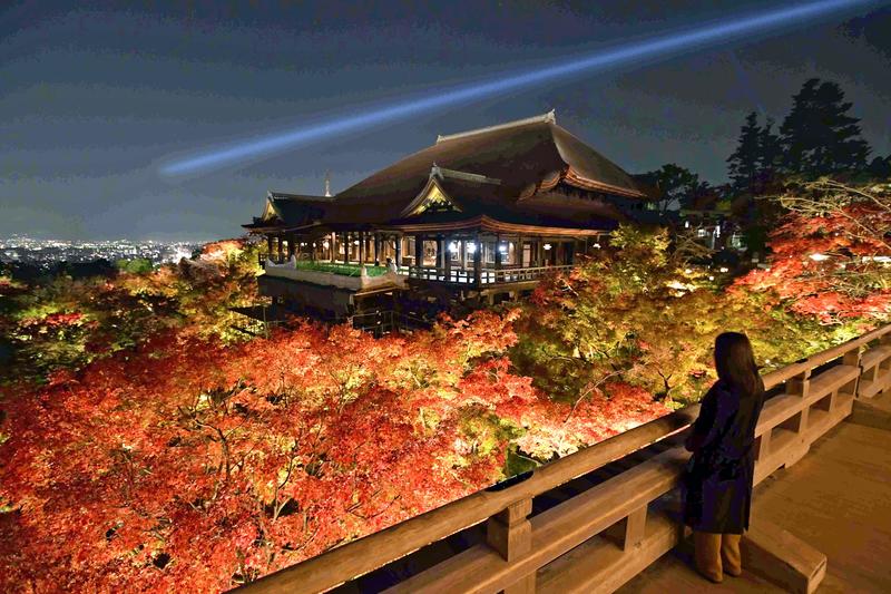 KYOTO/OTSU -- The bright red autumn leaves of maple trees and the famous wooden stage at Kiyomizudera temple are lit up against the dark sky in Kyoto. The illuminated scenery is an autumn nighttime viewing event at the temple, a UNESCO World Cultural Heritage site, and will continue until Nov. 30.