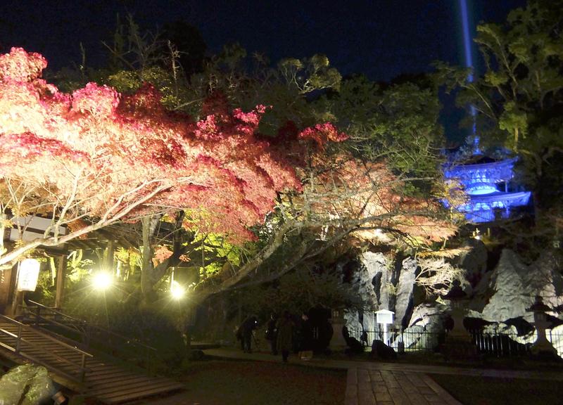 About 1,000 momiji Japanese maple trees on the grounds of the temple are beautifully lit by about 500 lights of various sizes.