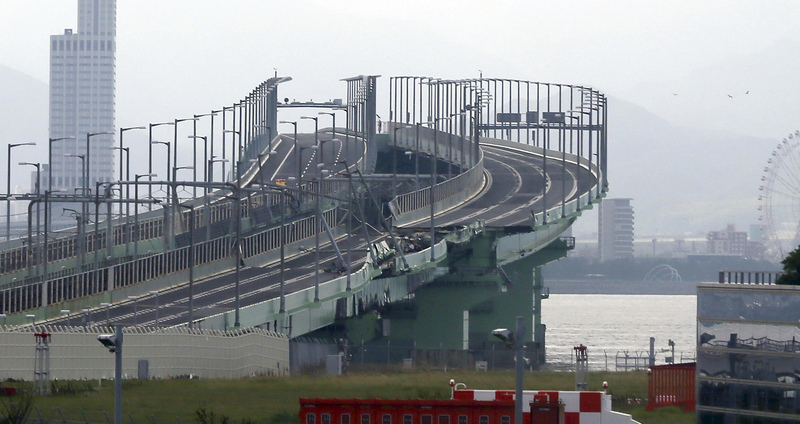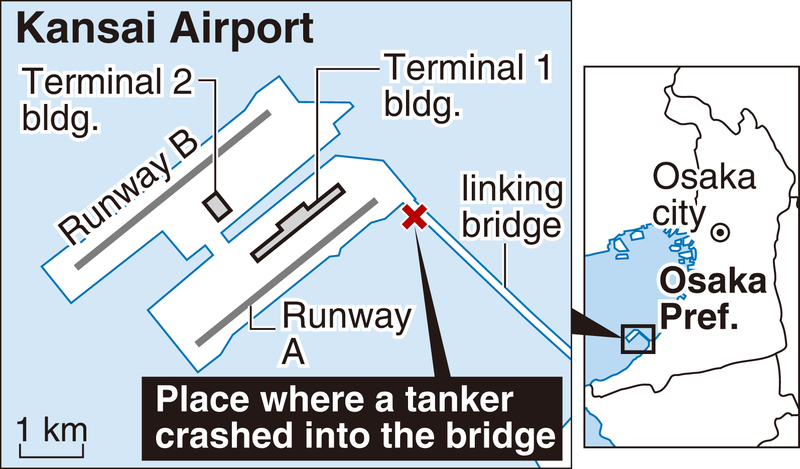 The chartered buses with a capacity of about 50 people each started after 8 a.m. on the day to ferry passengers from the airport to Izumisano Station of the Nankai Electric Railway in Izumisano, Osaka Prefecture. The buses had to pass over a 3.8-kilometer bridge connecting the airport island with the mainland. During the storm, a tanker had crashed into a span of the bridge carrying what are normally the outbound lanes of traffic, so the buses had to use the span with the inbound lanes.