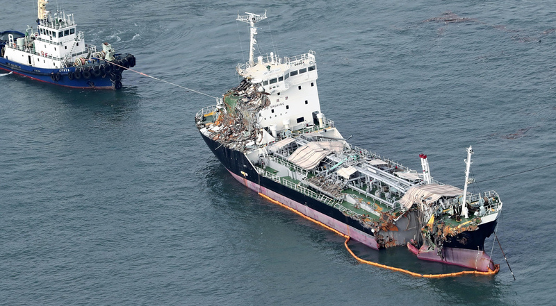 All 11 crew members on the 2,591-ton tanker Houn Maru, which crashed into the bridge, were rescued on Tuesday night. The tanker then was pulled out of the bridge, in which it was embedded, by three tugboats early Wednesday. The Japan Coast Guard's Fifth Regional Coast Guard Headquarters has begun its inspection of the tanker.