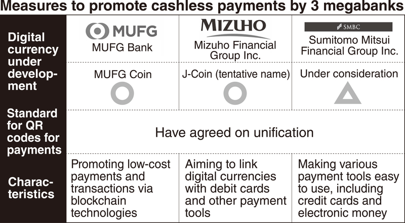 As part of efforts to encourage the use of cashless payments for goods and services, the three megabanks have agreed to unify their standards for QR codes, which customers can use to make payments without cash through their smartphones.