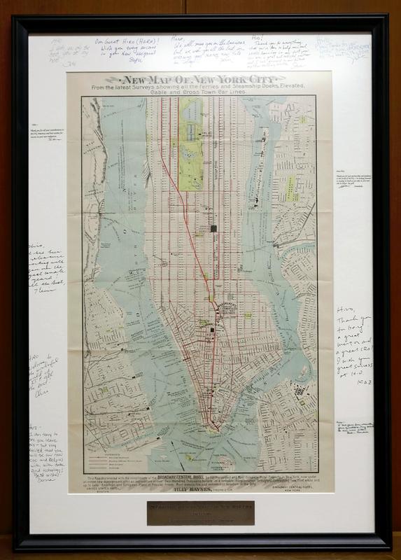 Kamezawa was transferred to the United States for two years, and when he returned to Japan, he got a map of New York from 12 local executives as a gift. It's an old map of Manhattan before the bridges were built, with messages from each colleague written in the margins. The map is placed in Kamezawa's office for him to occasionally look back on his time there.