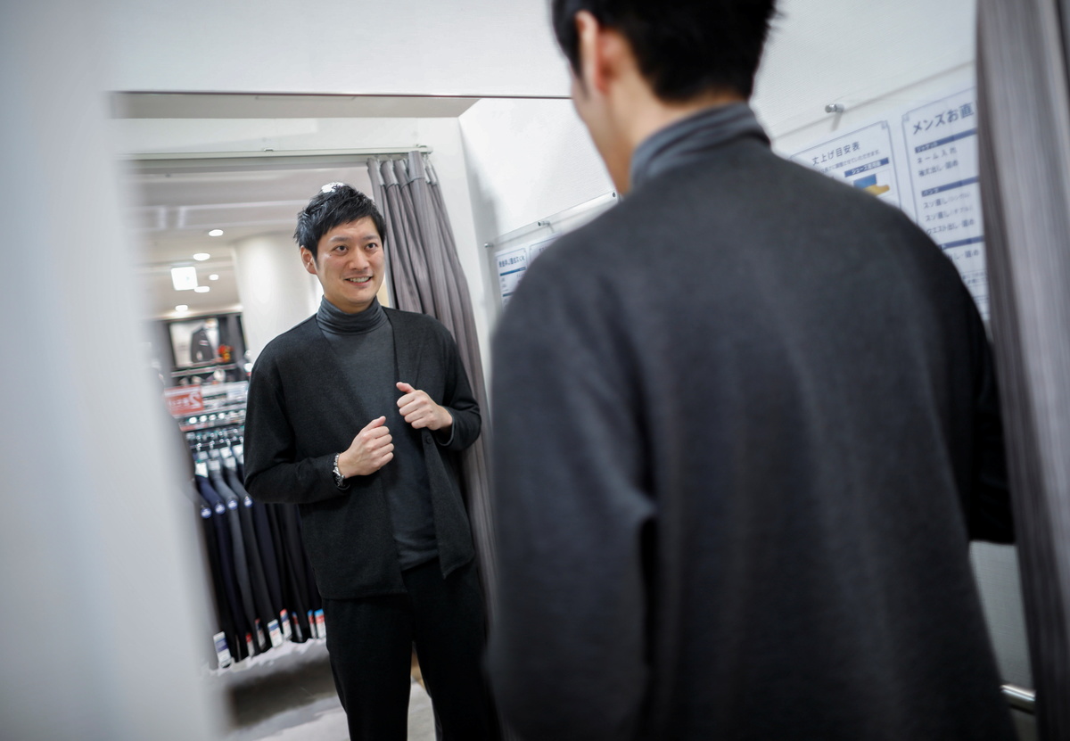An employee of Japanese retailer Aoki Holdings wearing 'Pajamas Suit' that looks like a business suit for business people working from home is reflected on a mirror inside a try-on booth at the company's shop, amid the coronavirus disease (COVID-19) outbreak, in Tokyo, Japan December 16, 2020. REUTERS/Issei Kato