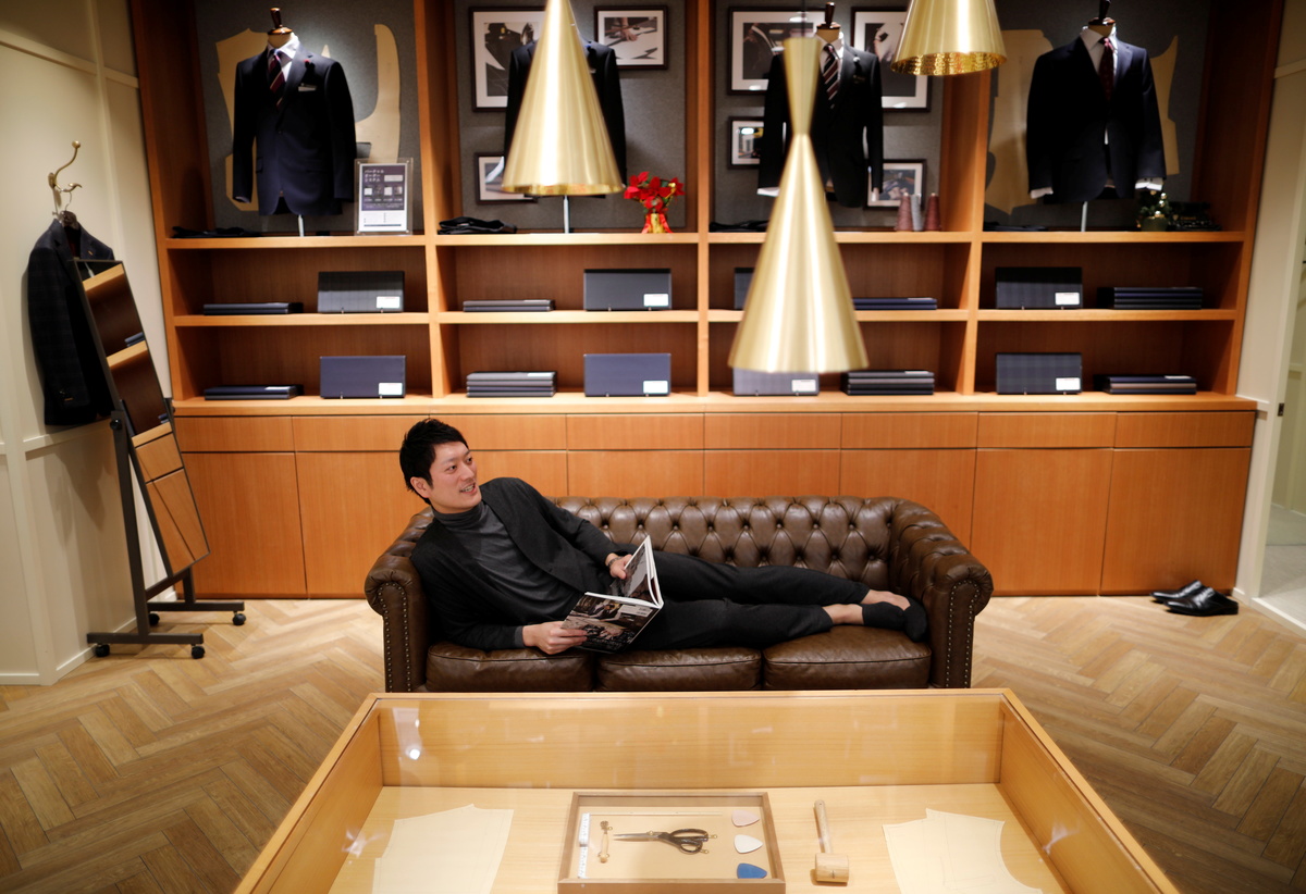 An employee of Japanese retailer Aoki Holdings wearing 'Pajamas Suit' that looks like a business suit for business people working from home simulates a telework at the company's shop, amid the coronavirus disease (COVID-19) outbreak, in Tokyo, Japan December 16, 2020. REUTERS/Issei Kato