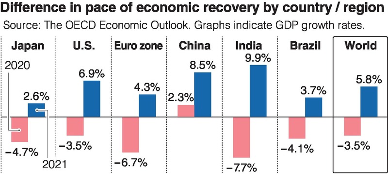 The OECD forecasts economic growth of 6.9% in the United States and 4.3% in the Euro zone, where vaccinations are progressing. Both figures were 0.4 percentage points above March estimates. In comparison, Japan's slow recovery is noticeable, as it is seen experiencing negative growth for a second consecutive quarter in April-June due to the state of emergency declaration.