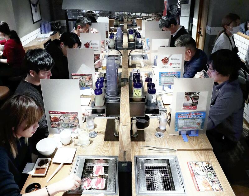 Yakiniku Like has long been a yakiniku grilled meat chain that caters to people who want to dine solo. Its branches in the Tokyo area are now seeing a boom in popularity. One location was busy with customers who were sitting one-by-one between partitions and grilling meat over a roaster in front of each person. Most customers were seen finishing their meals in about 20 minutes.