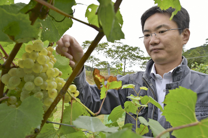 After the disaster, Hirota moved from Matsudo, Chiba Prefecture, to Kamaishi. Hirota, 32, had been a member of his high school rugby team and is now taking part in the project led by the Bon Courage Tohoku volunteer organization. With advice from local farmers, project participants are growing about 150 vine plants on a 0.1-hectare field and expect to produce several dozen bottles of wine next spring.