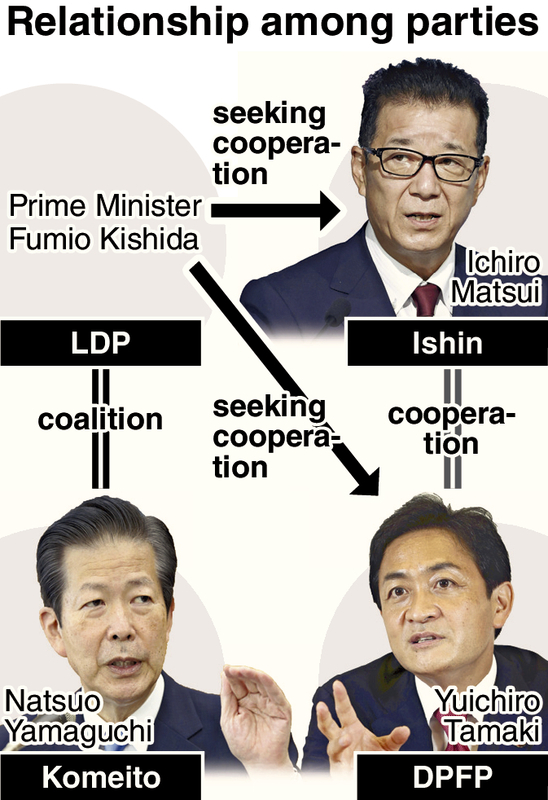 Prime Minister Fumio Kishida is considering strengthening the nation's defense capabilities, including acquiring the capability to attack enemy bases, which would allow Japan to destroy enemy missile launch bases for self-defense purposes. Some within the LDP are hoping for Ishin and the DPFP's cooperation also in the security field.