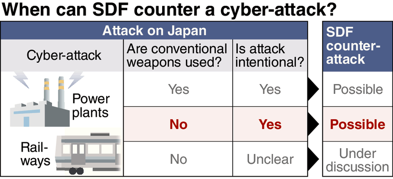 The current guidelines only stipulate that the SDF can respond to a cyber-attack targeting the nation's crucial infrastructure, such as a malicious program that triggers a glitch, if the cyber-attack is accompanied by an attack involving conventional weapons such as missiles. Therefore, whether the SDF can respond to cyber-attacks that are not accompanied by conventional weapons has become a point of debate.