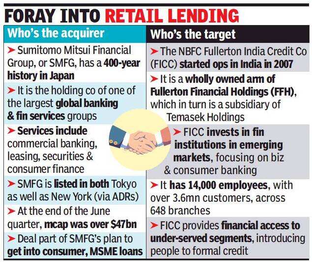 MUMBAI: Sumitomo Mitsui Financial Group, the Japan headquartered global financial major, is buying out Fullerton India, the Indian non-banking financial arm of Singapore-based Fullerton Financial, for about $2.6 billion, or nearly Rs 19,300 crore.