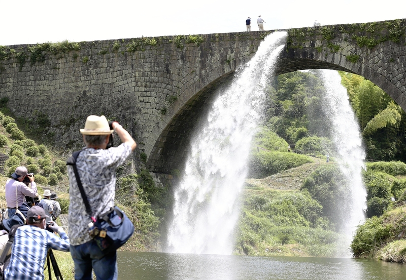 Water was released Tuesday for the first time in four years and three months from Tsujunkyo bridge -- a government-designated important cultural asset in Yamato, Kumamoto Prefecture -- in a commemorative discharge, open to the public, that followed the completion of preservation and repair work to the stone structure, which was originally damaged in the 2016 Kumamoto earthquake.