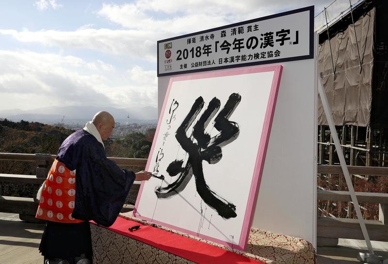 On Wednesday, Seihan Mori, the head priest of Kiyomizudera temple, wrote the kanji in calligraphy at the UNESCO World Heritage-designated temple in Kyoto.