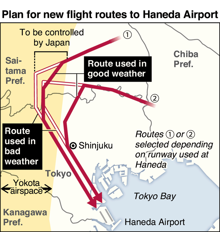 The new routes will establish a four-hour window in the evening to allow international flights to fly over central Tokyo during southerly winds. As this proposal entails the possibility of passenger flights flying through the Yokota airspace for a few minutes -- depending on such factors as weather and the runway to be used -- the Japan-U.S. Joint Committee has had consultations over how to control the airspace.