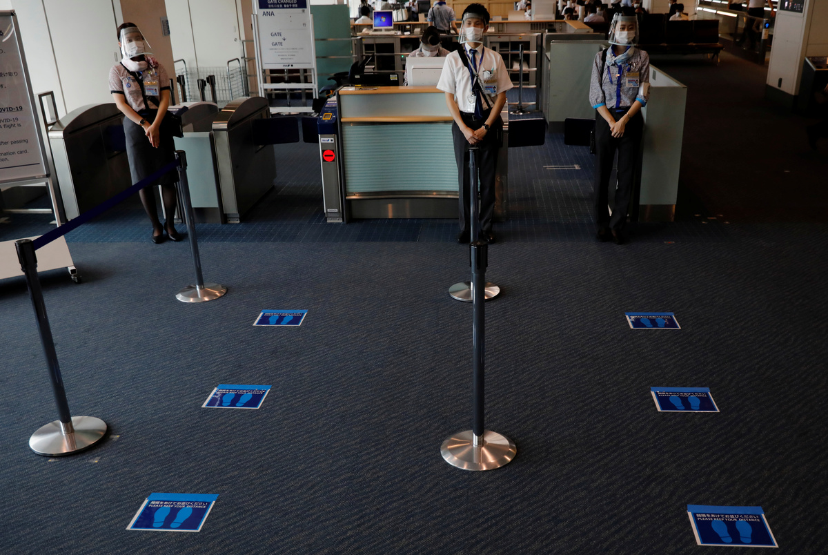 FILE PHOTO: Staff members of All Nippon Airways wearing protective masks and face shields work at a boarding gate where "social distancing" stickers are attached on its floor amid the coronavirus disease (COVID-19) outbreak at Haneda airport in Tokyo, Japan June 4, 2020. REUTERS/Kim Kyung-Hoon