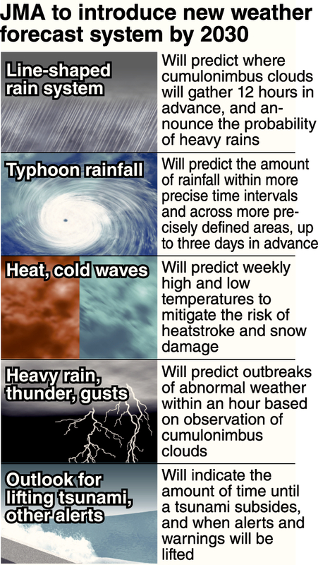 In addition, the JMA will release weekly forecasts of heat and cold waves for the coming month, and begin issuing "severe storm alerts" that predict outbreaks of thunder and gusts within the hour.