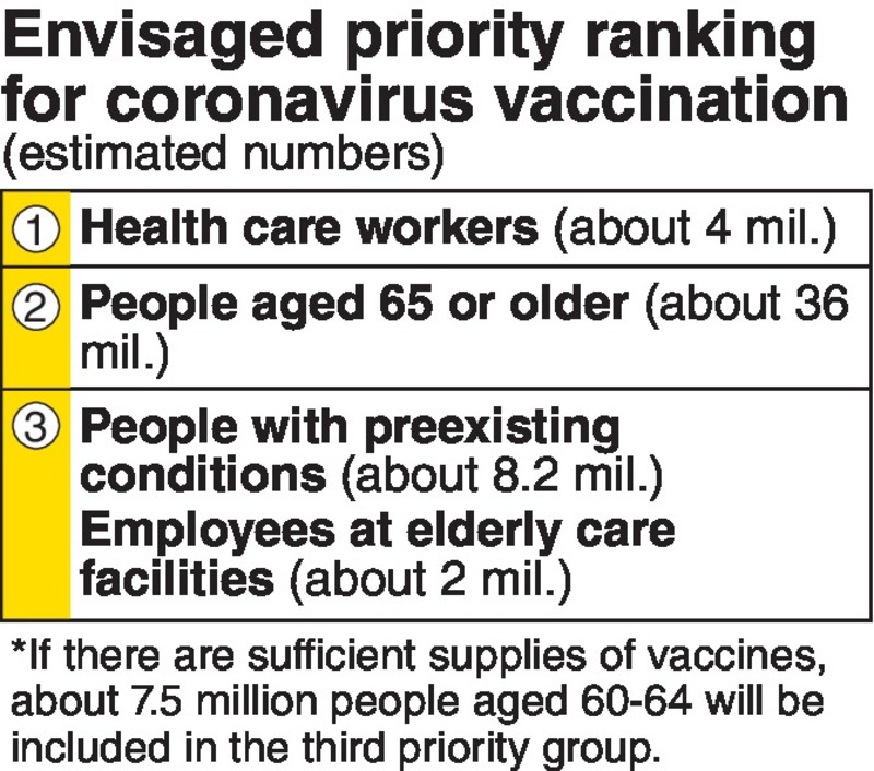 The number of health care workers to be given priority totals about 4 million people. They include doctors, pharmacists, staff at public health centers, emergency service workers, Self-Defense Forces personnel and others who have frequent contact with COVID-19 patients.
