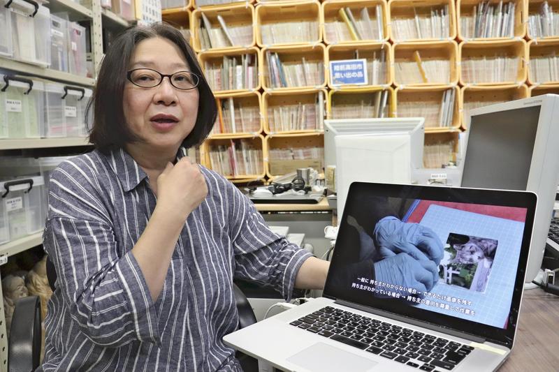 Mari Akiyama, co-representative of the organization, gives demonstrations of how to dry photo albums, cut out photos from damaged albums and methods for removing taints from photo prints.