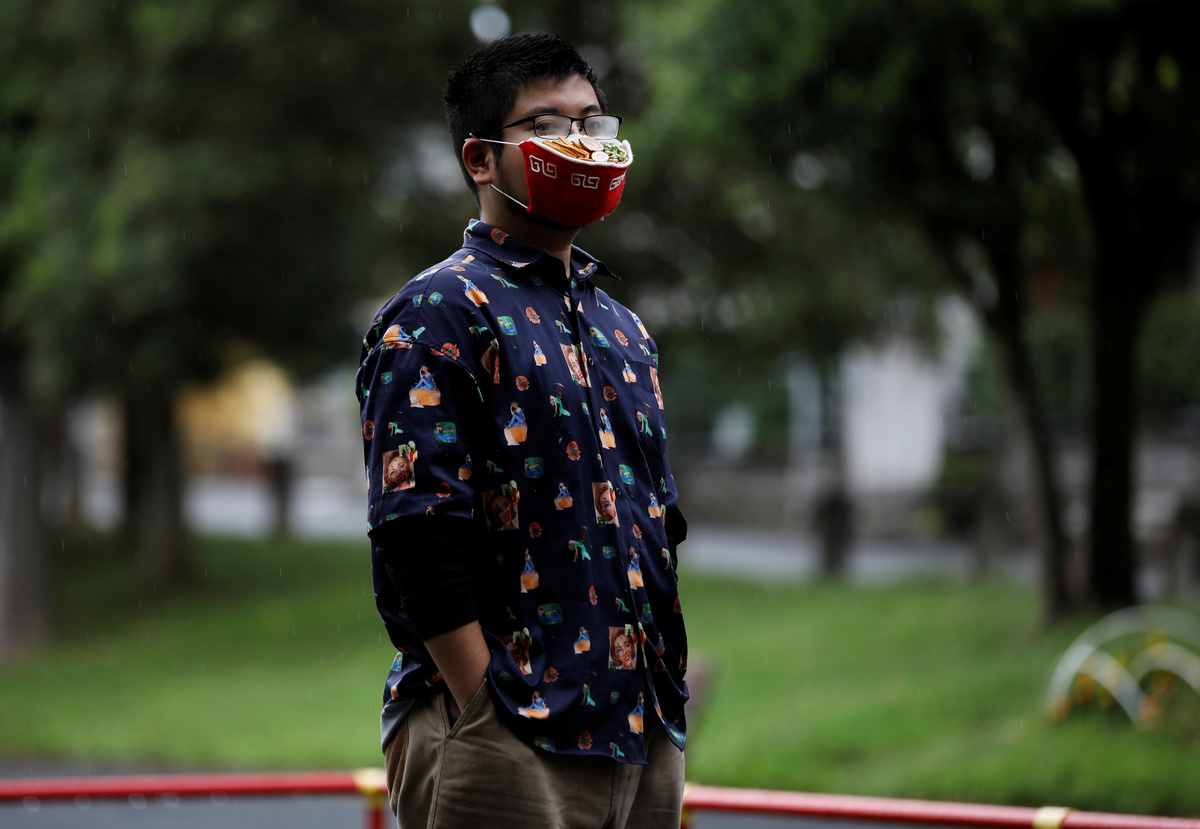 Japanese designer Takahiro Shibata's wears a protective mask that looks like a steaming bowl of ramen noodle soup while posing for a photo at a park, following the coronavirus disease (COVID-19) outbreak in Yokohama, Japan September 23, 2020. REUTERS/Kim Kyung-Hoon