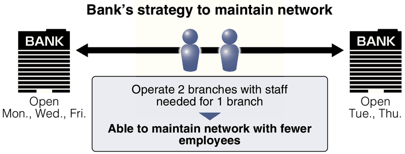 For example, if one branch is open on Mondays, Wednesdays and Fridays while another is open on Tuesdays and Thursdays, the two branches can be run using the number of staff needed for a single branch. Resona will also consider opening branches on Saturday or Sunday in place of a weekday, in a bid to tailor its holidays to fit customers' needs.