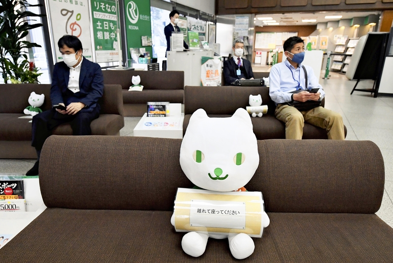 Resona Bank Ltd., a major Japanese bank has placed big stuffed plush versions of Resonya, the bank's mascot character on sofas in the customer's waiting area at some of its Tokyo branches and beyond in order to keep customers sitting at a distance from each other as a measure to contain the spread of novel coronavirus.