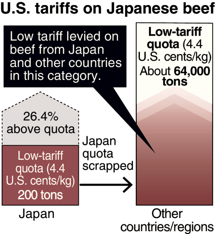 Japan and other countries in the category would be able to export a combined total of about 64,000 tons of beef to the United States per year under the low tariff rate of 4.4 cents per kilogram.