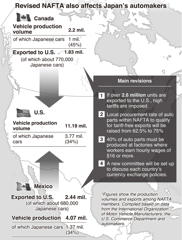 The revised North American Free Trade Agreement that the United States, Mexico and Canada agreed to on Sunday is expected to have a significant impact on Japanese automakers.