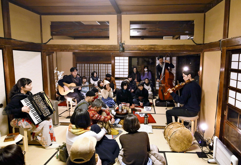 This month, the members of Hyogen, a musical group composed of four people who graduated from the Tokyo University of the Arts, stayed in the house and composed music. For four days during their stay, the public could observe them composing in a large 18-tatami mat room, and they gave a concert on the final day.