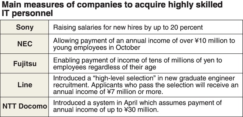 Regarding high salaries, NTT Docomo Inc. started in April a system to enable payment of an annual income of up to 30 million yen. Since fiscal 2019, Sony Corp. has raised salaries for new employees having high skills in cutting-edge areas by up to 20 percent. NEC Corp. will introduce a system in October under which employees, including new hires, can receive an annual income of over 10 million yen if they have achieved great research results in academic societies or other places.